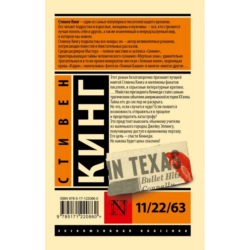 - «11/22/63» – это книга, которая перенесет вас в маленький американский городок, где обычный учитель Джейк Эппинг получает доступ к временному порталу и отправляется в прошлое, чтобы спасти жизнь президента Кеннеди. Узнайте вместе с ним, возможно ли изменить историю и предотвратить трагедию.