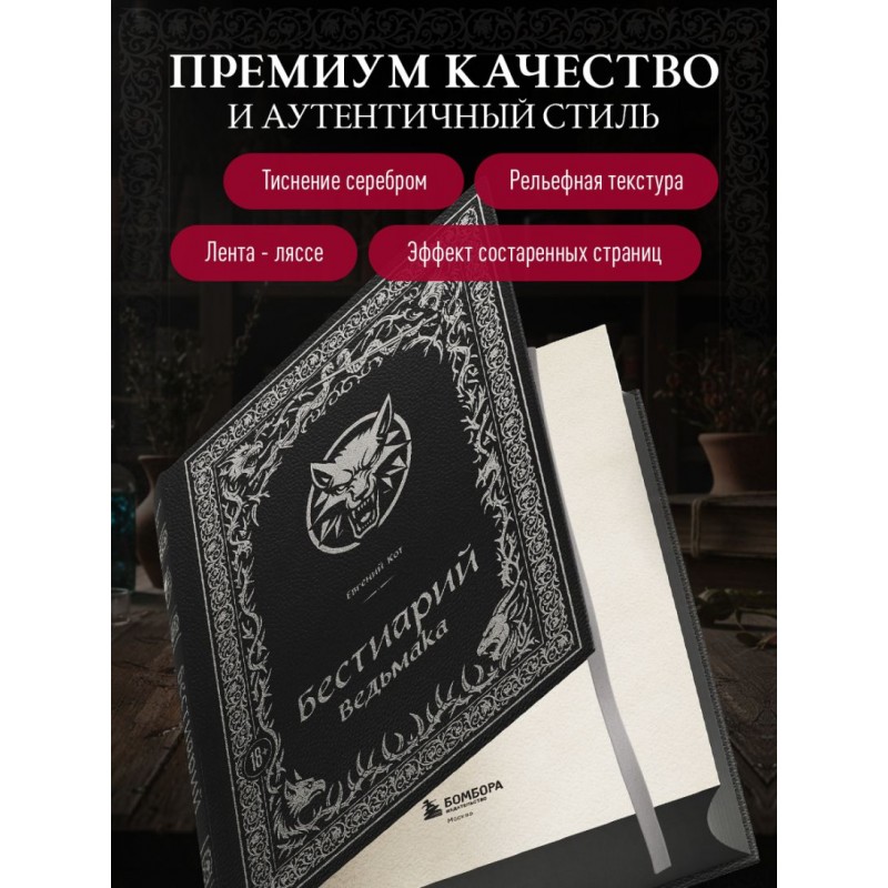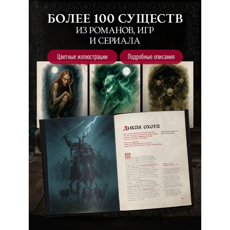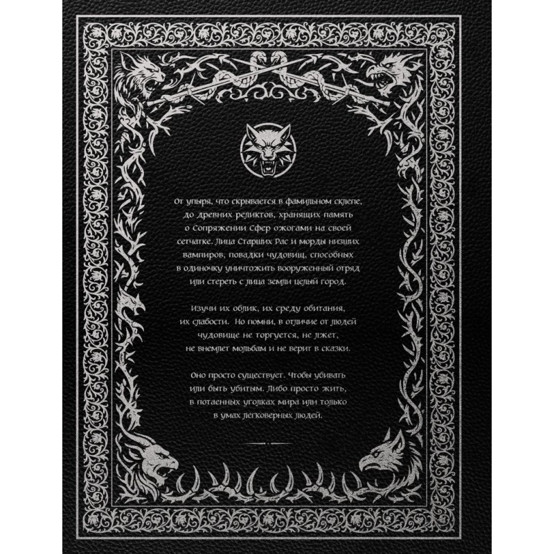 Эта книга — настоящее сокровище для поклонников вселенной Ведьмака. Шелест плотных страниц (с рукописными пометками на полях от бывшего владельца-ведьмака) перенесет тебя в душные топи Велена или на морозные берега Скеллиге. А качественная цветная печать позволит рассмотреть всех чудовищ очень пристально, чтобы ничего не упустить! Про красоту обложки (которая, кстати, на ощупь как шкура виверны) и говорить нечего! Ну, и чтобы ты всегда знал, на какой твари остановился, и не приходилось загибать углы страниц — черная атласная лента-ляссе!