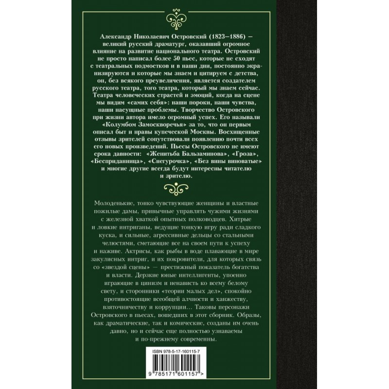 Таковы персонажи Островского в пьесах, вошедших в этот сборник. Образы, как драматические, так и комические, созданы им очень давно, но и сейчас еще полностью узнаваемы и по-прежнему современны.