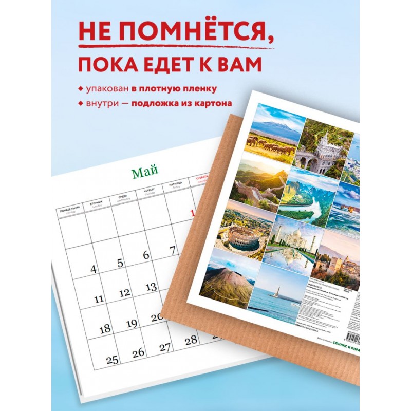 В календаре подобраны красочные фотографии чудес света: невероятные архитектурные шедевры и природные красоты. Отправляйтесь исследовать город на шелковом пути Бухару, разгадайте загадку таинственного Мачу-Пикчу или прогуляйтесь по местам съемок фильма «Аватар» в национальном парке Чжанцзяцзе.