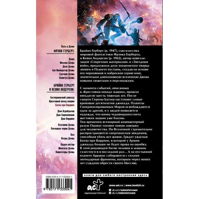 Тем временем всемирный компьютерный разум Омниус готовит новую ловушку для человечества. По Вселенной стремительно распространяется смертоносная эпидемия, способная убить все живое. Грядет ужасная Битва при Коррине, в которой у Армии джихада больше не будет права на ошибку. В этой решающей битве человек и машина схлестнутся в последний раз… А на пустынной планете Арракис собираются с силами легендарные фримены, которым через много лет суждено обрести своего Мессию.