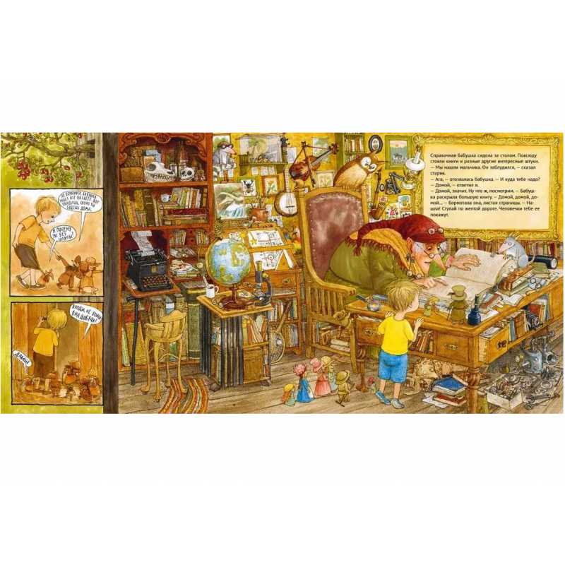 Мальчик очутился в незнакомом месте и не понимает, ни как сюда попал, ни как вернуться назад. Но на подмогу приходят маленькие человечки и Справочная бабушка. Важно все время следовать за желтой полоской: она обязательно выведет к дому. Желтая дорога вьется между скал, где странные жирафы травят анекдоты, ныряет в лес, населенный добрыми троллями, приводит в пустыню, уставленную кораблями и лодками, и превращается в желтую реку – а дальше и море, и остров, и замок принцессы, и лабиринт. На каждом повороте мальчика поджидают не только опасности, но и добрые помощники - то хулиганистые галки, то суровый капитан подводной лодки, то говорящий пес, то художница, рисующая волшебные картины. А в случае чего выручает подаренный человечками необыкновенный рюкзак.
