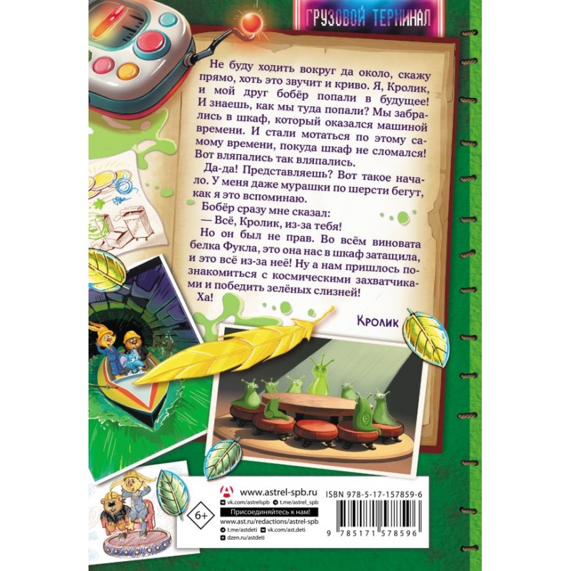 Не буду ходить вокруг да около, скажу прямо, хоть это звучит и криво. Я, Кролик, и мой друг бобёр попали в будущее! И знаешь, как мы туда попали? Мы забрались в шкаф, который оказался машиной времени. И стали мотаться по этому самому времени, покуда шкаф не сломался! Вот вляпались так вляпались. Да, да! Представляешь? Вот такое начало. У меня даже мурашки по шерсти бегут, как я это вспоминаю. Бобёр сразу мне сказал: — Всё, Кролик, из-за тебя! Но он был не прав. Во всём виновата белка Фукла, это она нас в шкаф затащила, и это всё из-за неё! Ну а нам пришлось познакомиться с космическими захватчиками и победить зелёных слизней! Ха! (