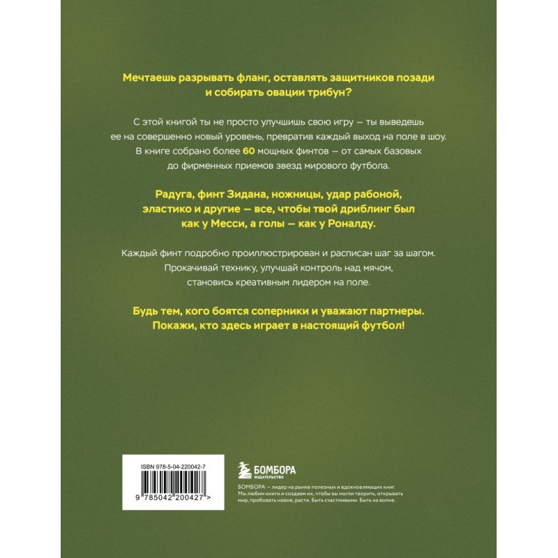В книге собрано более 60 мощных финтов — от самых базовых до фирменных приемов звёзд мирового футбола. «Радуга», финт Зидана, «ножницы», удар «рабоной», «эластико» и другие — всё, чтобы твой дриблинг был как у Месси, а голы — как у Роналду.