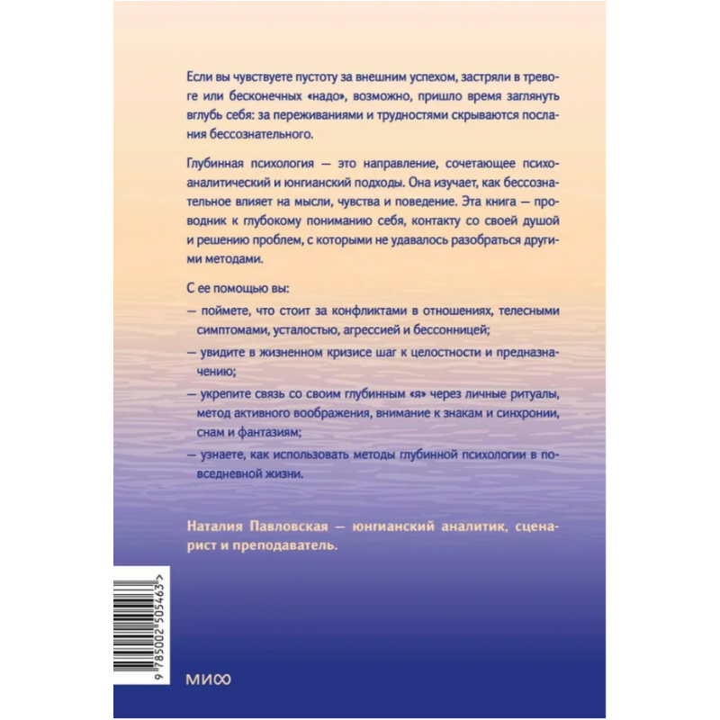 Вдохновляющий путеводитель от юнгианского психоаналитика по поиску смысла и духовности в повседневной жизни. Люди приходят в психотерапию с типичными проблемами: хотят устранить трудности в отношениях, перестать беспокоиться, избавиться от неприятных эмоций. Но за всем этим может скрываться глубинная причина — недостаток контакта с чем-то большим, чем мы сами: со своей душой, с бессознательным. Без этого контакта мы ощущаем бессмысленную рутину, внутреннюю пустоту, кризис, тупик. А его восстановление позволяет чувствовать глубину каждого дня, видеть в проблемах не только вызовы, но и смысл, и красоту человеческой жизни. Бессознательное говорит с нами через сны, символы, фантазии, телесные ощущения, совпадения (синхронии). Глубинная психология — подход, который позволяет понимать эти послания, скрытые в повседневных переживаниях — тревоге, бессоннице, усталости, конфликтах. Тогда симптомы рассматриваются не как "поломки", а как подсказки на пути к развитию и целостности. В книге вы найдете инструменты глубинной психологии на каждый день, чтобы понимать язык бессознательного, находить смысл в повседневных переживаниях, установить глубокий контакт с собой.