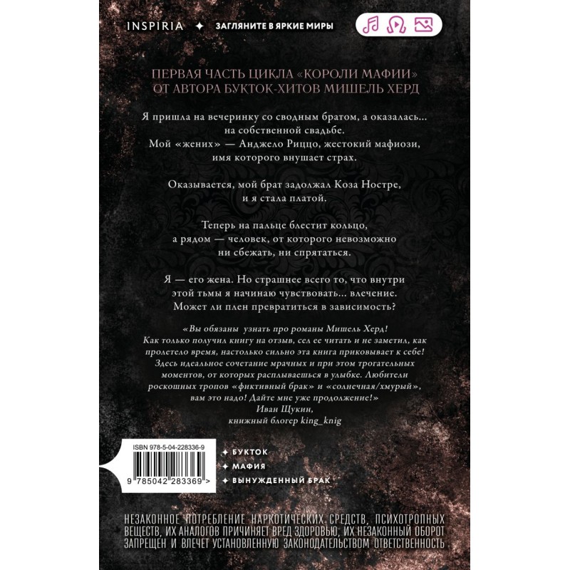 Первая часть цикла «Короли мафии» от автора Букток-хитов Мишель Херд. Я пришла на вечеринку со сводным братом, а оказалась... на собственной свадьбе. Мой «жених» — Анджело Риццо, жестокий мафиози, имя которого внушает страх. Оказывается, мой брат задолжал Коза Ностре, и я стала платой. Теперь на пальце блестит кольцо, а рядом — человек, от которого невозможно ни сбежать, ни спрятаться. Я — его жена. Но страшнее всего то, что внутри этой тьмы я начинаю чувствовать... влечение. Может ли плен превратиться в зависимость?