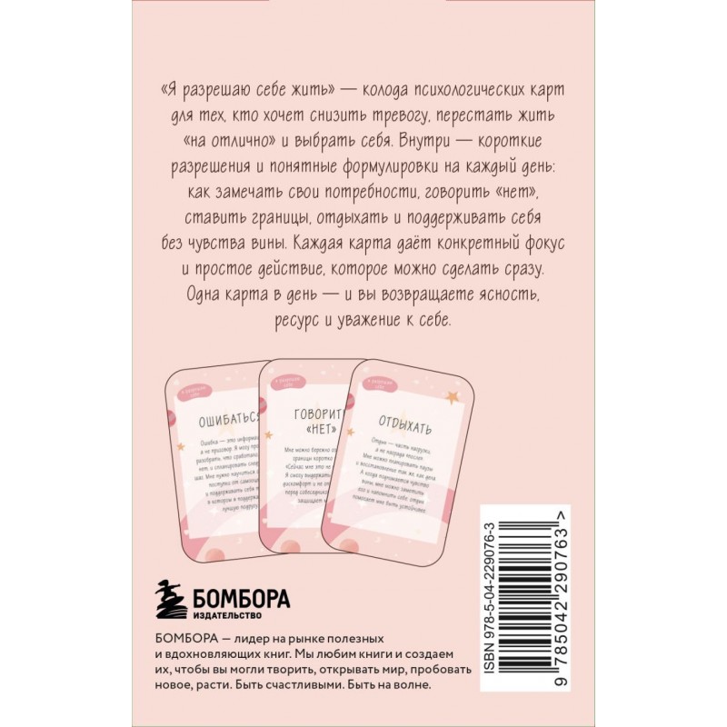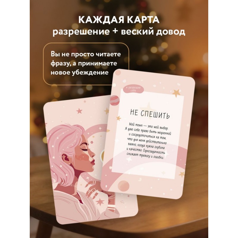 «Я разрешаю себе» — колода психологических карт для тех, кто хочет снизить тревогу, перестать жить «на отлично» и выбрать себя. Внутри — короткие разрешения и понятные формулировки на каждый день: как замечать свои потребности, говорить «нет», ставить границы, отдыхать и поддерживать себя без чувства вины. Каждая карта дает конкретный фокус и простое действие, которое можно сделать сразу. Подходит для самостоятельной практики, парных разговоров и работы с психологом/коучем. Одна карта в день — и вы возвращаете ясность, ресурс и уважение к себе!