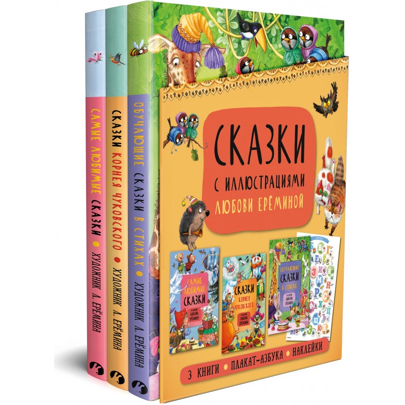Есть сказки — на все времена: их читали наши родители и мы сами, будут читать наши дети и дети наших детей. Именно из таких произведений состоит комплект книг «Сказки с иллюстрациями Л. Ерёминой». Внутри комплекта 3 сборника. Первый с произведениями Корнея Чуковского. Второй с любимыми русскими народными и классическими зарубежными сказками. И третий содержит обучающие сказки в стихах, которые помогут ребенку освоить счет, выучить буквы, предлоги и вежливые слова. Кроме того, в комплект входят плакат-азбука (50Х70 см) и наклейки к нему.