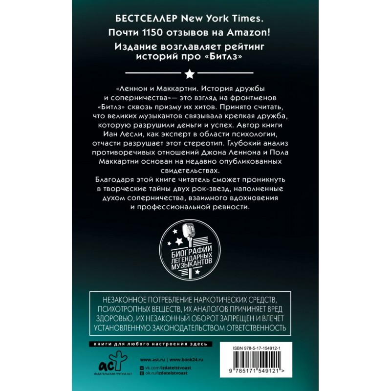 "Леннон и Маккартни. История дружбы и соперничества" — это взгляд на фронтменов Битлз сквозь призму их хитов. Принято считать, что великих музыкантов связывала крепкая дружба, которую разрушили деньги и успех. Автор книги Иан Лесли, как эксперт в области психологии, отчасти разрушает этот стереотип. Глубокий анализ противоречивых отношений Джона Леннона и Пола Маккартни основан на недавно опубликованных свидетельствах.
