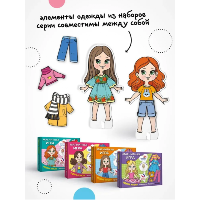 «Одень куклу. Модница Злата» — это игра, которая надолго займет ребенка и разовьет его фантазию. В коробке находится фигурка куколки и 24 магнитных предмета одежды. Кукла устанавливается на подставку, после чего можно подобрать ей подходящий наряд для любого случая. Одежда на крепких магнитах хорошо держится на кукле, поэтому с ней можно полноценно играть. А если собрать всю коллекцию, то вариаций для игр станет ещё больше — одежда из разных наборов подходит всем куклам в серии.