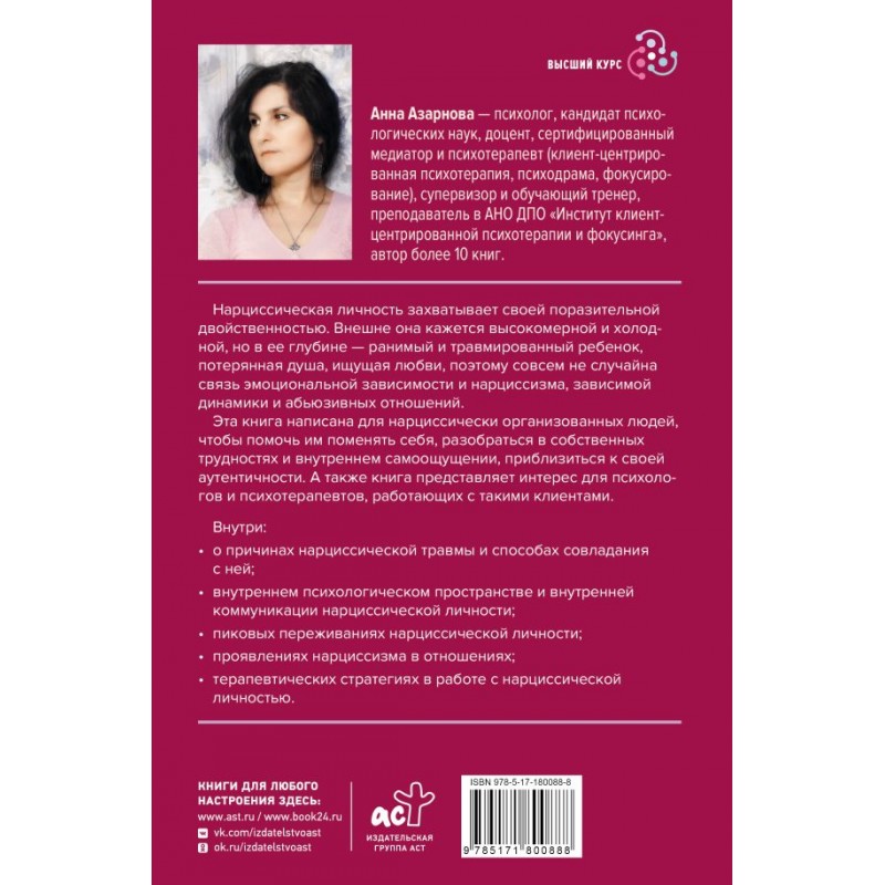 Анна Азарнова — психолог, кандидат психологических наук, доцент, сертифицированный медиатор и психотерапевт (клиент-центрированная психотерапия, психодрама, фокусирование), супервизор и обучающий тренер, преподаватель в АНО ДПО "Институт клиент-центрированной психотерапии и фокусинга", автор более 10 книг. Нарциссическая личность захватывает своей поразительной двойственностью. Внешне она кажется высокомерной и холодной, но в ее глубине — ранимый и травмированный ребенок, потерянная душа, ищущая любви, поэтому совсем не случайна связь эмоциональной зависимости и нарциссизма, зависимой динамики и абьюзивных отношений.