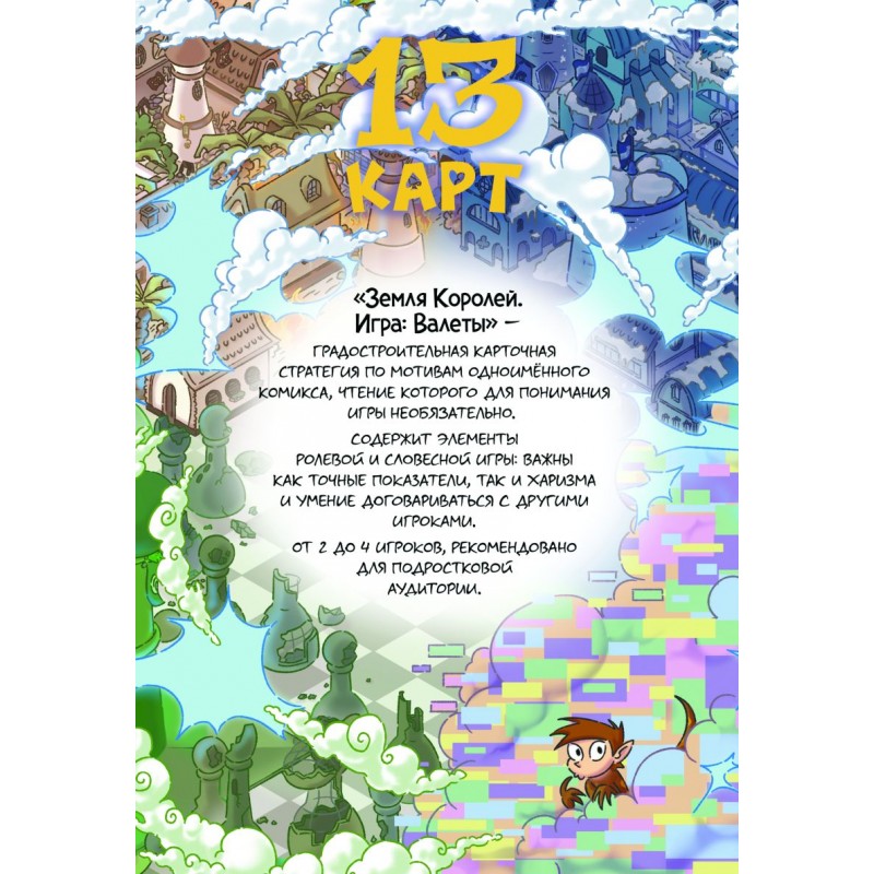 Настольная игра «13 КАРТ: Земля Королей, Валеты (Дополненное издание)» — это захватывающая градостроительная карточная стратегия по мотивам одноимённого комикса. Содержит элементы ролевой и словесной игры: важны как точные показатели, так и харизма и умение договариваться с другими игроками. От 2 до 4 игроков, рекомендовано для подростковой аудитории.