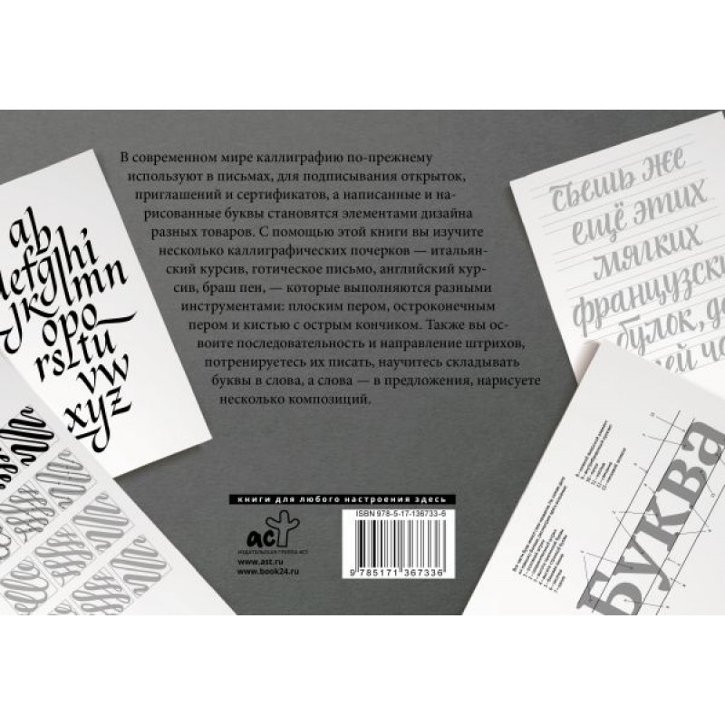 В современном мире каллиграфию по‑прежнему используют в письмах, для подписывания открыток, приглашений и сертификатов, а написанные и нарисованные буквы становятся элементами дизайна разных товаров. С помощью этой книги вы изучите несколько каллиграфических почерков — итальянский курсив, готическое письмо, английский курсив, браш пен, — которые выполняются разными инструментами: плоским пером, остроконечным пером и кистью с острым кончиком. Также вы освоите последовательность и направление штрихов, потренируетесь их писать, научитесь складывать буквы в слова, а слова — в предложения, нарисуете несколько композиций.