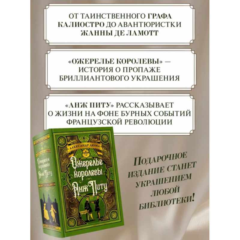 «Ожерелье королевы» и «Анж Питу» — два увлекательных историко-приключенческих романа Александра Дюма, действие которых происходит во Франции во второй половине XVIII века. Роман «Ожерелье королевы» повествует о загадочном исчезновении бриллиантового украшения, которое король Людовик XVI заказал для своей супруги Марии-Антуанетты. Под подозрением оказываются все приближенные к королевскому двору, включая таинственного графа Калиостро, авантюристку Жанну де Ламотт и саму королеву… Главный герой романа «Анж Питу» — провинциальный студент, вовлеченный в бурный водоворот Великой французской революции.