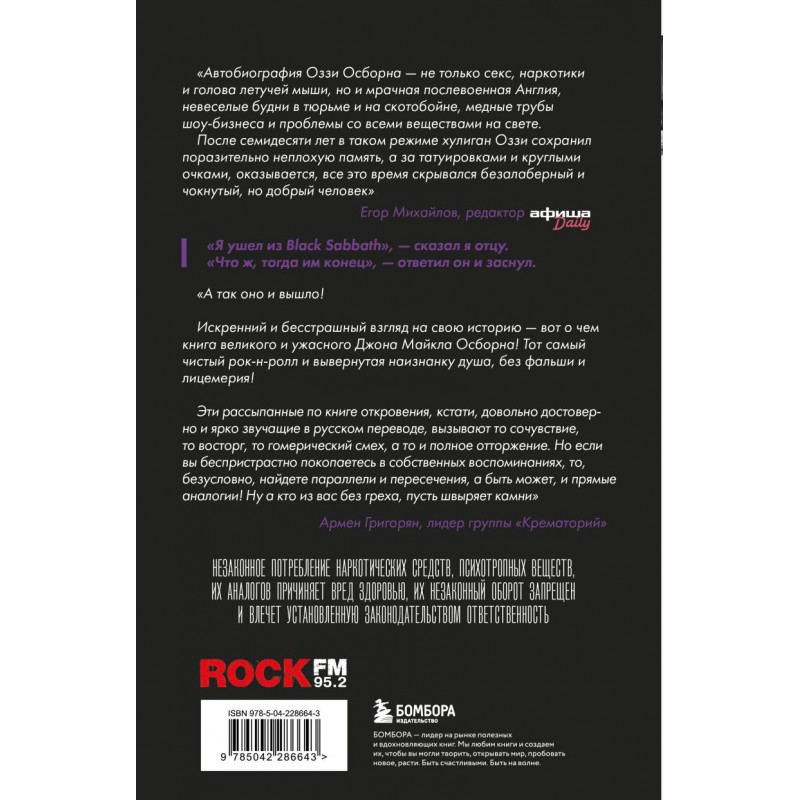Но история жизни и пути к славе одного из самых известных музыкантов планеты не идут ни в какое сравнение с его воспоминаниями о них. Каким бы зловещим Оззи ни казался на сцене, его острое чувство юмора и самоиронии делают эту автобиографию настоящим кладом для любого ценителя рок-музыки.