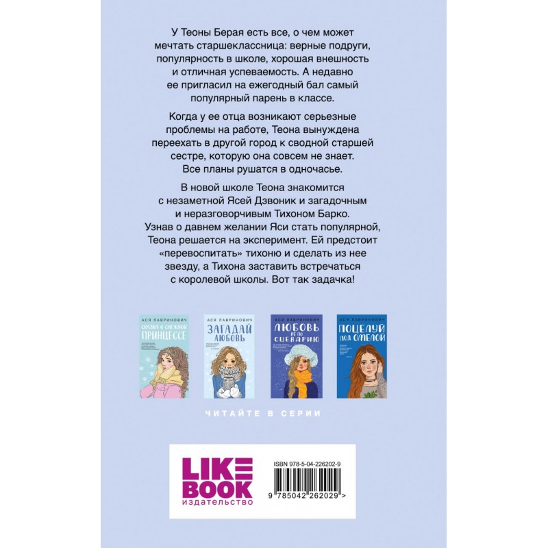 Один зимний бал. Одна милая карликовая свинка. И одна маленькая ложь, которая перевернет все с ног на голову. Этот Новый год станет незабываемым! У Теоны Берая есть все, о чем может мечтать старшеклассница: верные подруги, популярность в школе, хорошая внешность и отличная успеваемость. А недавно ее пригласил на ежегодный бал самый популярный парень в классе. Когда у ее отца возникают серьезные проблемы на работе, Теона вынуждена переехать в другой город к сводной старшей сестре, которую она совсем не знает. Все планы рушатся в одночасье. В новой школе Теона знакомится с незаметной Ясей Дзвоник и загадочным и неразговорчивым Тихоном Барко. Узнав о давнем желании Яси стать популярной, Теона решается на эксперимент. Ей предстоит «перевоспитать» тихоню и сделать из нее звезду, а Тихона заставить встречаться с королевой школы. Вот так задачка!