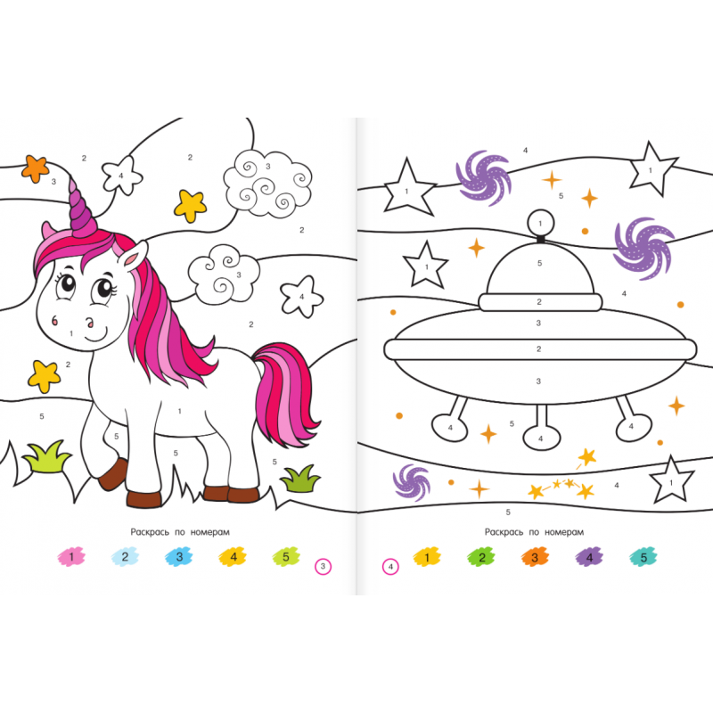 Разные уровни сложности — раскраски подойдут детям любого возраста. Рисунки с цифрами — освоение счёта до 10. Много деталей — развитие графических навыков и мелкой моторики. Сопоставление номера на картинке с соответствующим цветом — развитие логического мышления. Много страниц, плотная бумага. Подходит для раскрашивания красками, цветными карандашами, восковыми мелками и фломастерами. Зверята, машинки, единороги — разнообразие тем.