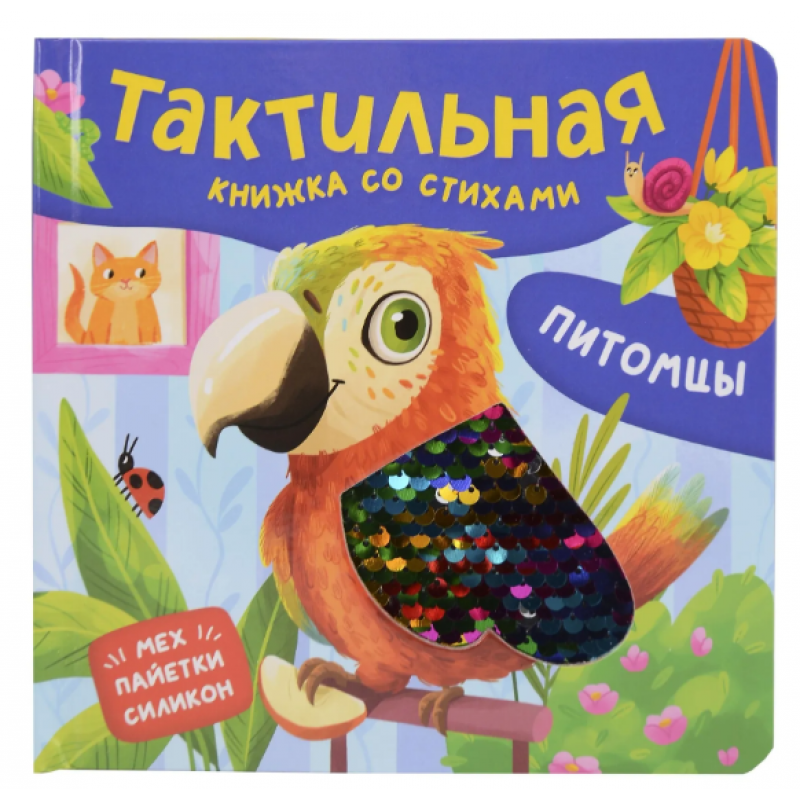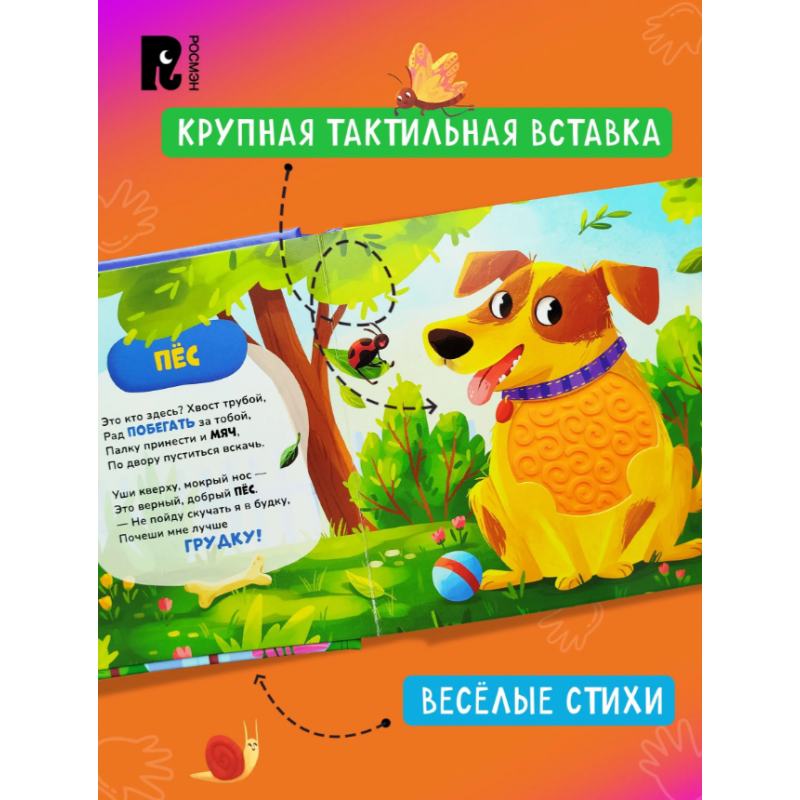 В книге «Питомцы» представлены крупные тактильные вставки с разными видами текстур: