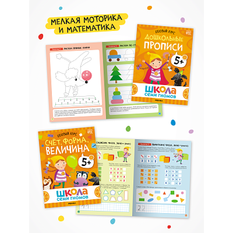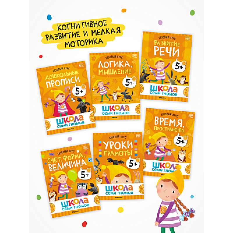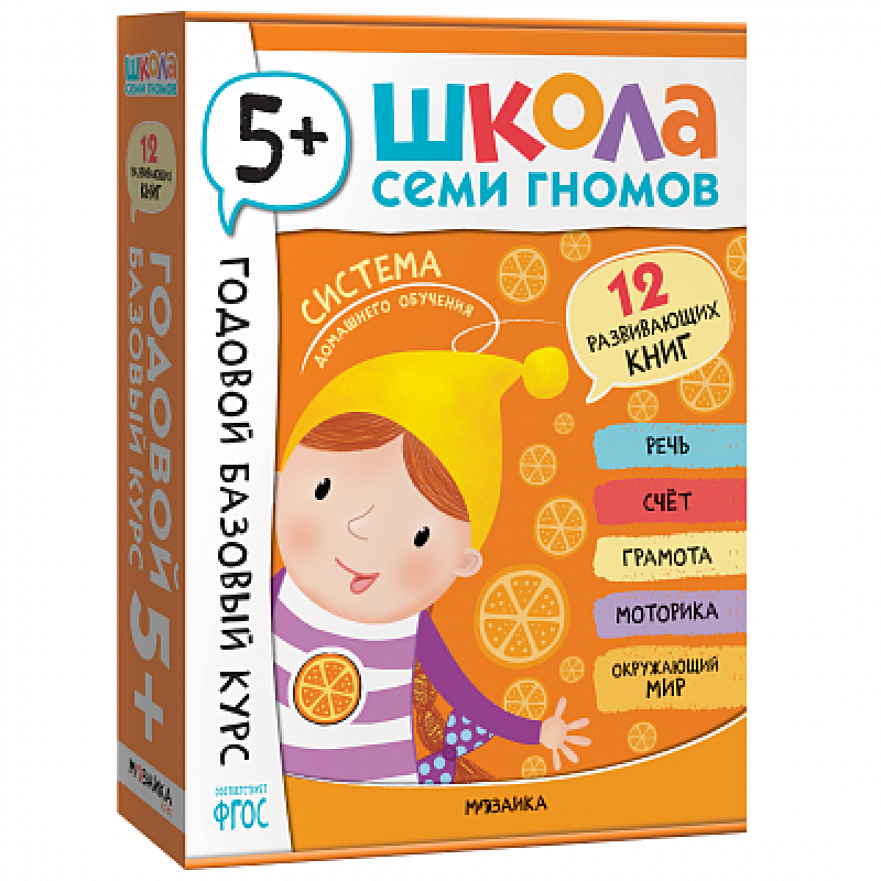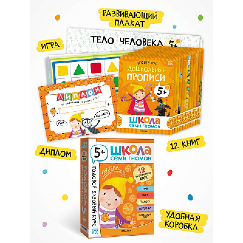 Годовой базовый курс. Комплект 5+ (Школа Семи Гномов. Базовый курс), 12 книг + развивающие материалы Школа Семи Гномов – это система, а не набор книг. Комплекс из 12 книг направлен на всестороннее развитие ребенка. 6 книг для развития когнитивных способностей: познавательный интерес, умение думать, анализировать, делать выводы. И еще 6 книг для на знакомства с окружающим миром, его закономерностями и взаимосвязями. Система выстроена таким образом, чтобы ребенок получил необходимые знания в правильный момент. Поэтому все книги в Школе Семи Гномов имеют четкую возрастную адресацию и разработаны строго с учетом возрастных возможностей ребенка. Но самое важное, чтобы занятия с ребенком давали результат и приносили радость. Поэтому все задания выстроены от простого к сложному и следуют принципу «развитие через игру». Заниматься с ребенком может любой взрослый, специальных знаний и опыта не требуется. Родительская страничка в каждой книге подскажет, что, как и почему нужно развивать в данном возрасте.