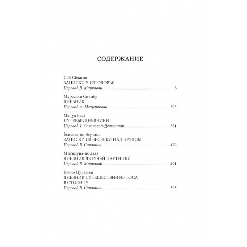 В настоящее издание вошли признанные шедевры японской лирической прозы: «Записки у изголовья» Сэй Сёнагон, «Дневник» Мурасаки Сикибу, «Путевые дневники» Мацуо Басё, фрагменты «Дневника летучей паутинки» Митицуна-но хаха, «Записки из беседки над прудом» Ёсисигэ-но Ясутанэ, «Дневник путешествия из Тоса в столицу» Ки-но Цураюки.