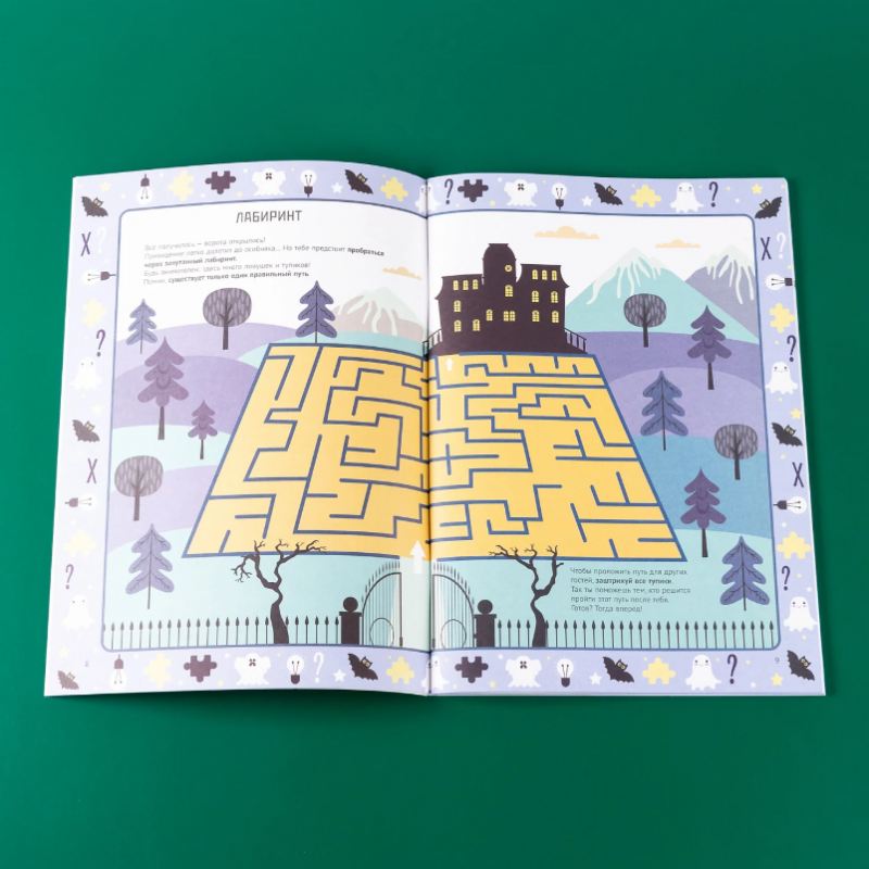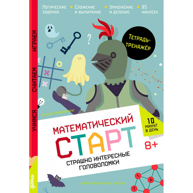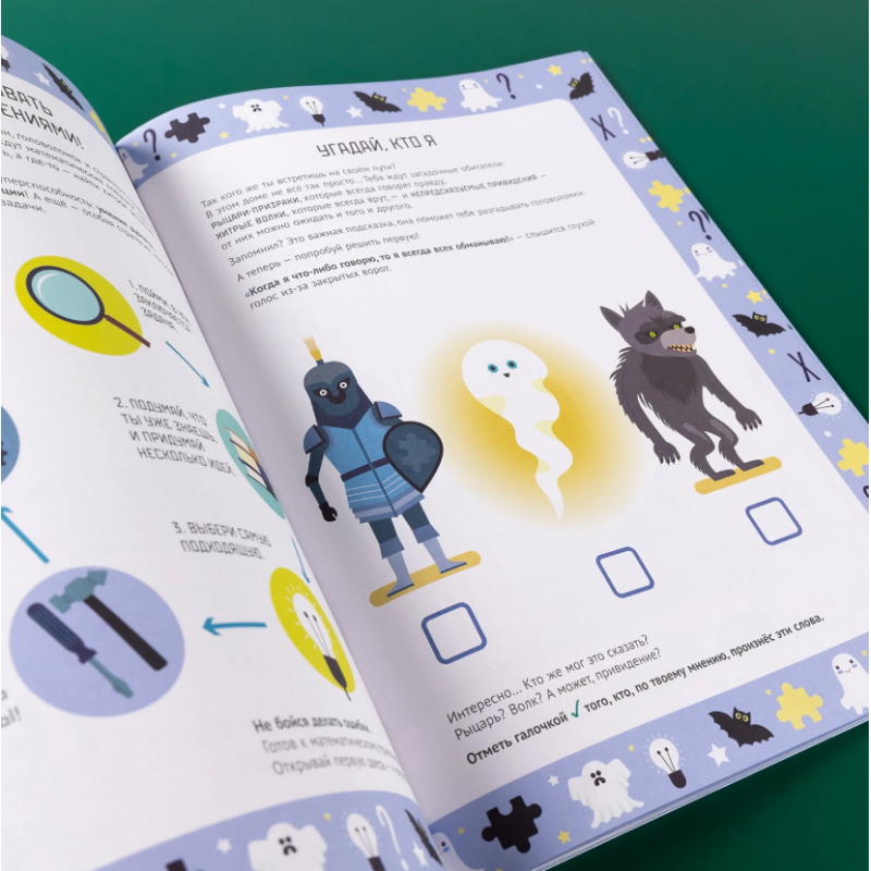 Книга построена как увлекательный квест, в котором ребёнок оказывается в старинном доме, полном загадок и тайн. Каждая комната — это новая история и новая головоломка, которую можно решить только с помощью логики, арифметики и внимания к деталям. Ребёнок помогает герою пройти через библиотеку с закодированными книгами, решить задачу рыцарей-призраков, найти правильную последовательность символов, разгадать шифр на сундуке с сокровищами, разобраться, какие двери ведут к выходу, а какие — в ловушку. Сюжет напоминает детективную головоломку: чтобы пройти все этапы, нужно не только решать задачи, но и думать, сравнивать, исключать, проверять гипотезы. Всё это в игровой форме, без скуки и стресса.