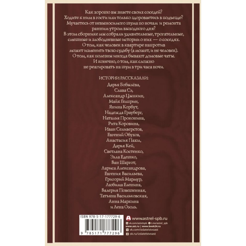 - В одной книге собраны злободневные, смешные и очень узнаваемые истории о домовых чатах, ночном шуме, ремонте в выходные и людях из квартир напротив, которые могут неожиданно изменить чужую жизнь. От фантастики до исторических рассказов, от драмы до сатиры. Они могут удивить, рассмешить, расстроить и даже испугать, но совершенно точно не оставят равнодушным.