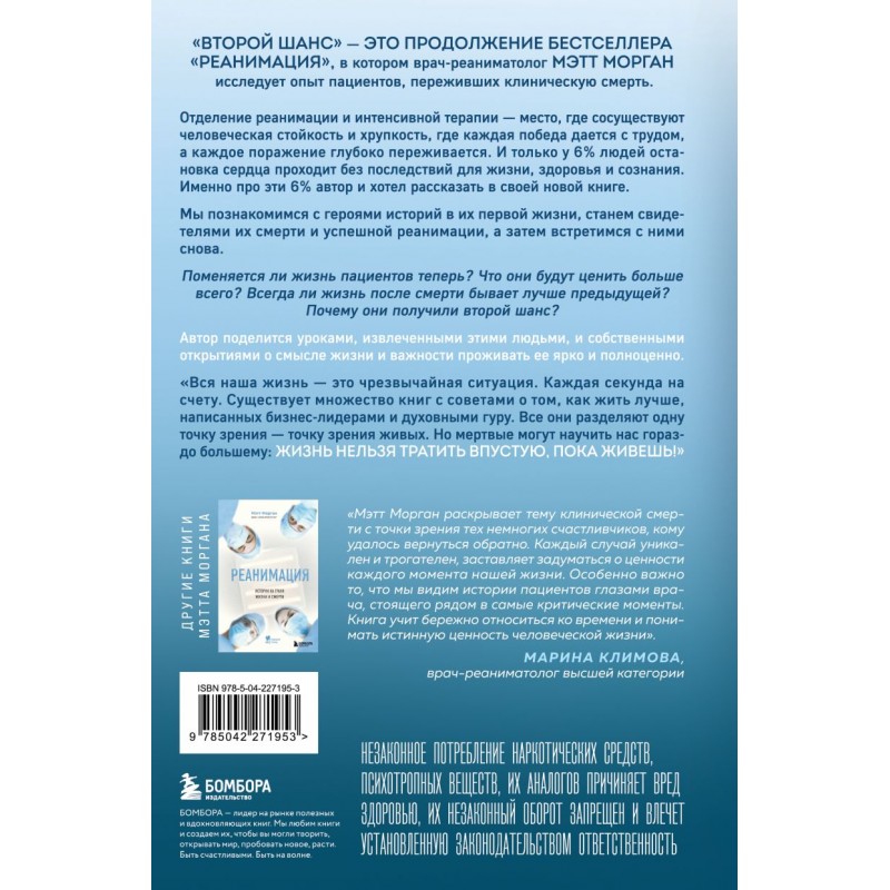 «Мэтт Морган раскрывает тему клинической смерти с точки зрения тех немногих счастливчиков, кому удалось вернуться обратно. Каждый случай уникален и трогателен, заставляя задуматься о ценности каждого момента нашей жизни. Особенно ценно то, что мы видим истории пациентов глазами врача, стоящего рядом в самые критические моменты. Книга учит бережно относиться ко времени и понимать истинную ценность человеческой жизни». — МАРИНА КЛИМОВА, врач-реаниматолог высшей категории