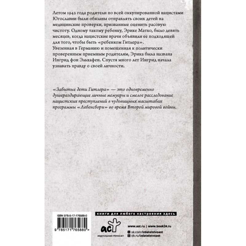 "Забытые дети Гитлера" — это одновременно душераздирающие личные мемуары и смелое расследование нацистских преступлений в чудовищных масштабах программы "Лебенсборн" во время Второй мировой войны.