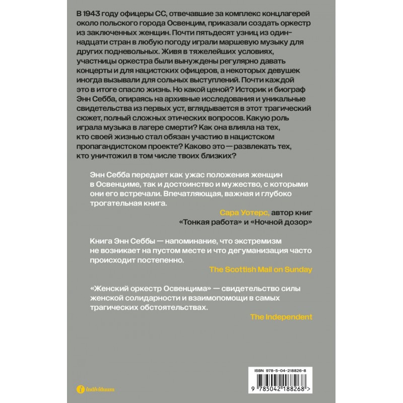 В 1943 году офицеры СС, отвечавшие за комплекс концлагерей около польского города Освенцим, приказали создать оркестр из заключенных женщин. Почти пятьдесят узниц из одиннадцати стран в любую погоду играли маршевую музыку для других подневольных. Живя в тяжелейших условиях, участницы оркестра были вынуждены регулярно давать концерты и для нацистских офицеров, а некоторых девушек иногда вызывали для сольных выступлений. Почти каждой это в итоге спасло жизнь. Но какой ценой? Историк и биограф Энн Себба, опираясь на архивные исследования и уникальные свидетельства из первых уст, вглядывается в этот трагический сюжет, полный сложных этических вопросов. Какую роль играла музыка в лагере смерти? Как она влияла на тех, кто своей жизнью стал обязан участию в нацистском пропагандистском проекте? Каково это — развлекать тех, кто уничтожил в том числе твоих близких?