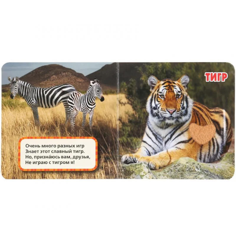 Книжка с тактильными элементами «Зоопарк» ТМ «УМка» сразу 3 в 1:- познакомит вашего ребёнка с различными обитателями зоопарка.- вы сможете прочитать и даже выучить наизусть добрые стихотворения Марины Дружининой о животных.- и, конечно, с особенной изюминкой – 4-мя тактильными элементами. То есть, до персонажей этой книжки можно дотронуться маленькими пальчиками – вместе с ребёнком вы погладите льва, тигра и других обитателей зоопарка!